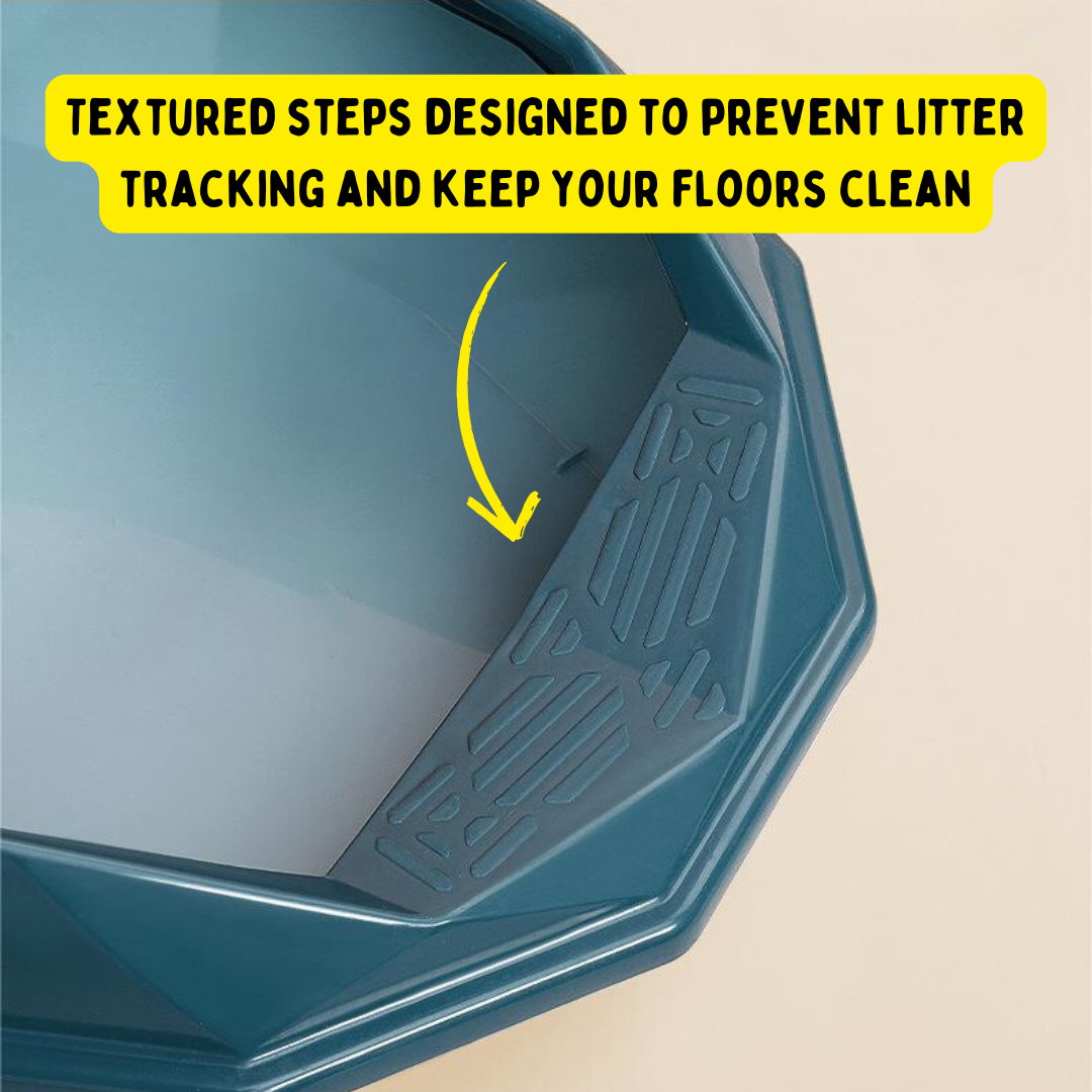 - The thoughtfully designed textured steps catch excess litter from your cat’s paws as they exit the litter box, keeping your floors cleaner and reducing mess.