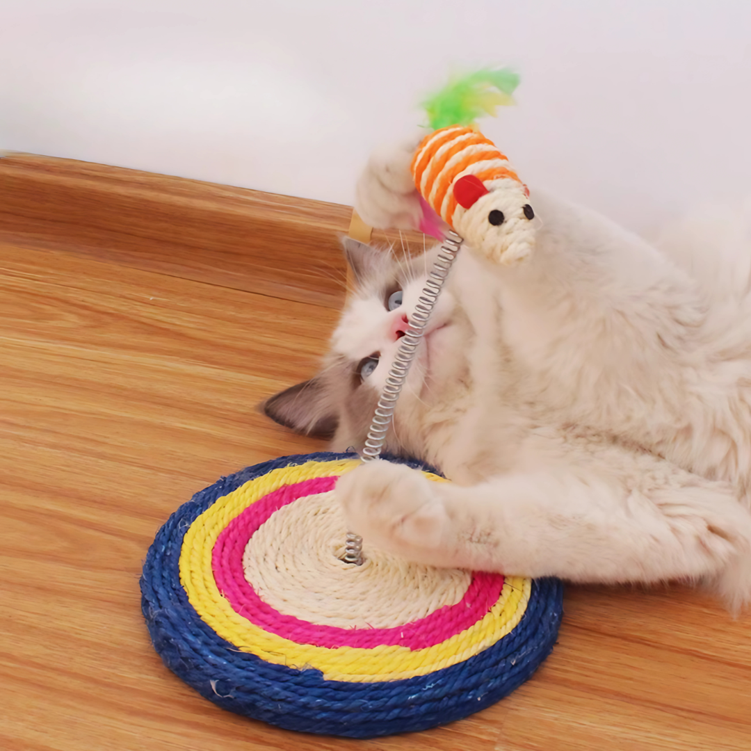 - The addition of a spring-mounted toy makes it more engaging for cats, encouraging them to bat, pounce, and play for hours.
